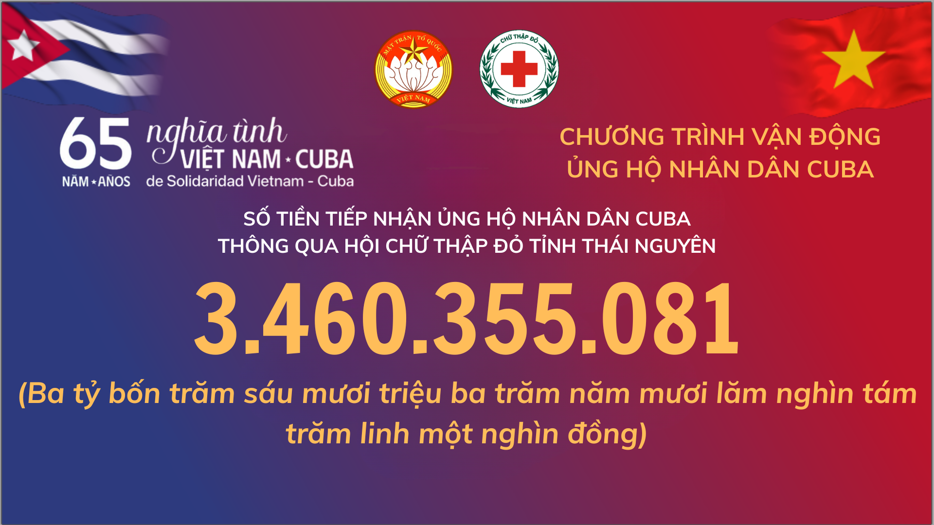 Thực hiện chủ trương của Trung ương Hội Chữ thập đỏ Việt Nam về việc vận động hỗ trợ Nhân dân Cuba vượt qua khó khăn, Hội Chữ thập đỏ tỉnh Thái Nguyên đã triển khai hoạt động tiếp nhận các nguồn đóng góp ủng hộ từ các tập thể, cá nhân, cơ quan, đơn vị trên địa bàn tỉnh và nhận được sự hưởng ứng rộng rãi của các cấp, ngành và người dân với tổng số tiền vận động ủng hộ đạt trên 3,4 tỷ đồng.